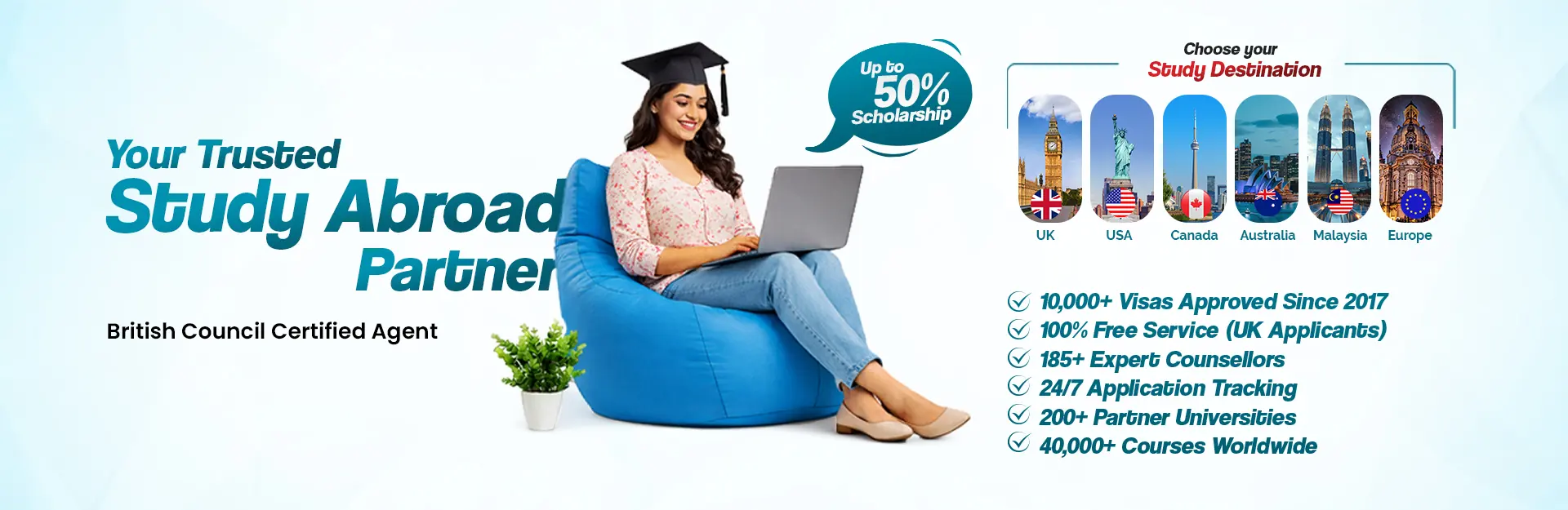 As a British Council-certified agent, we maintain international standards in counseling and transparency in accordance with the GDPR rules. Our team is trained, updated, and qualified enough to help you make informed decisions about studying abroad.
