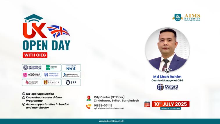 ⚡Discover your dynamic learning experience from the top-ranked Universities in UK. Meet Md Shah Rahim, Country Manager, Oxford International Education Group (OIEG) at our UK Open Day with OIEG event in AIMS Education Sylhet office on 10th July 2025 from 01pm to 04pm. Make your study abroad dreams come true and secure your offer letter with a scholarship.
